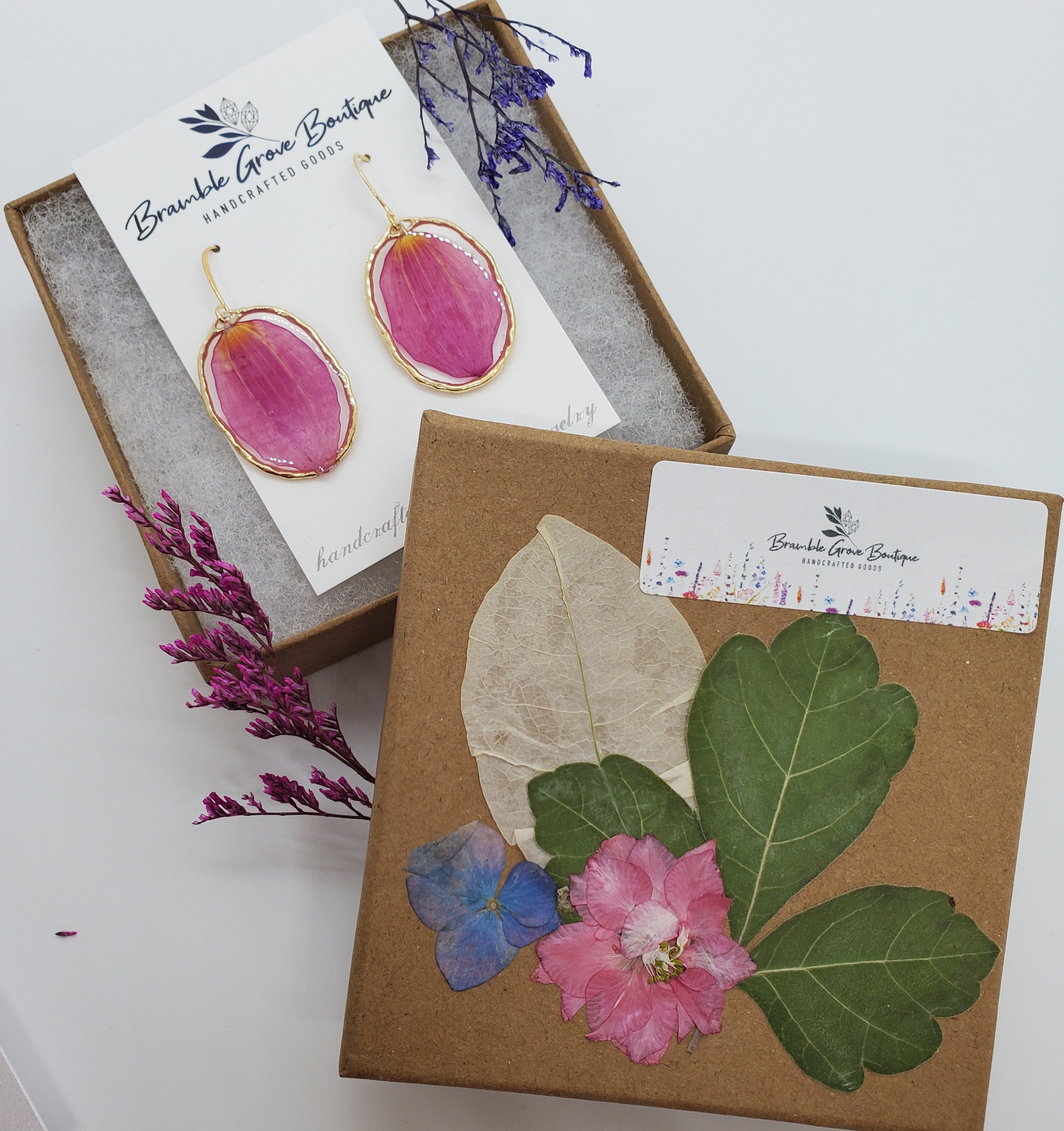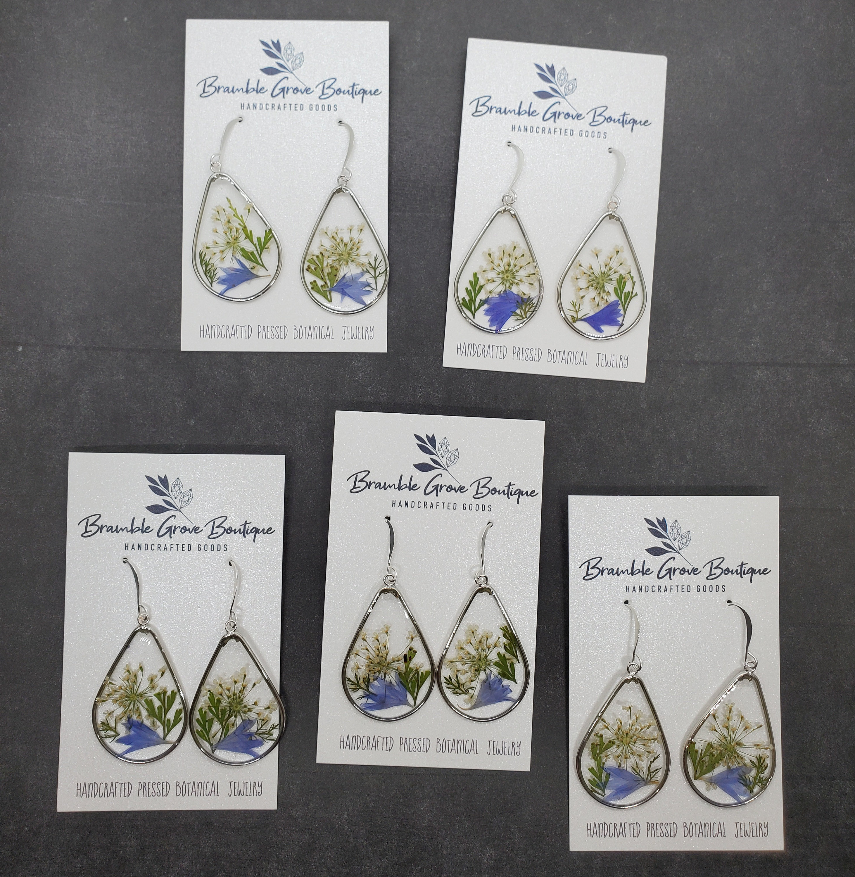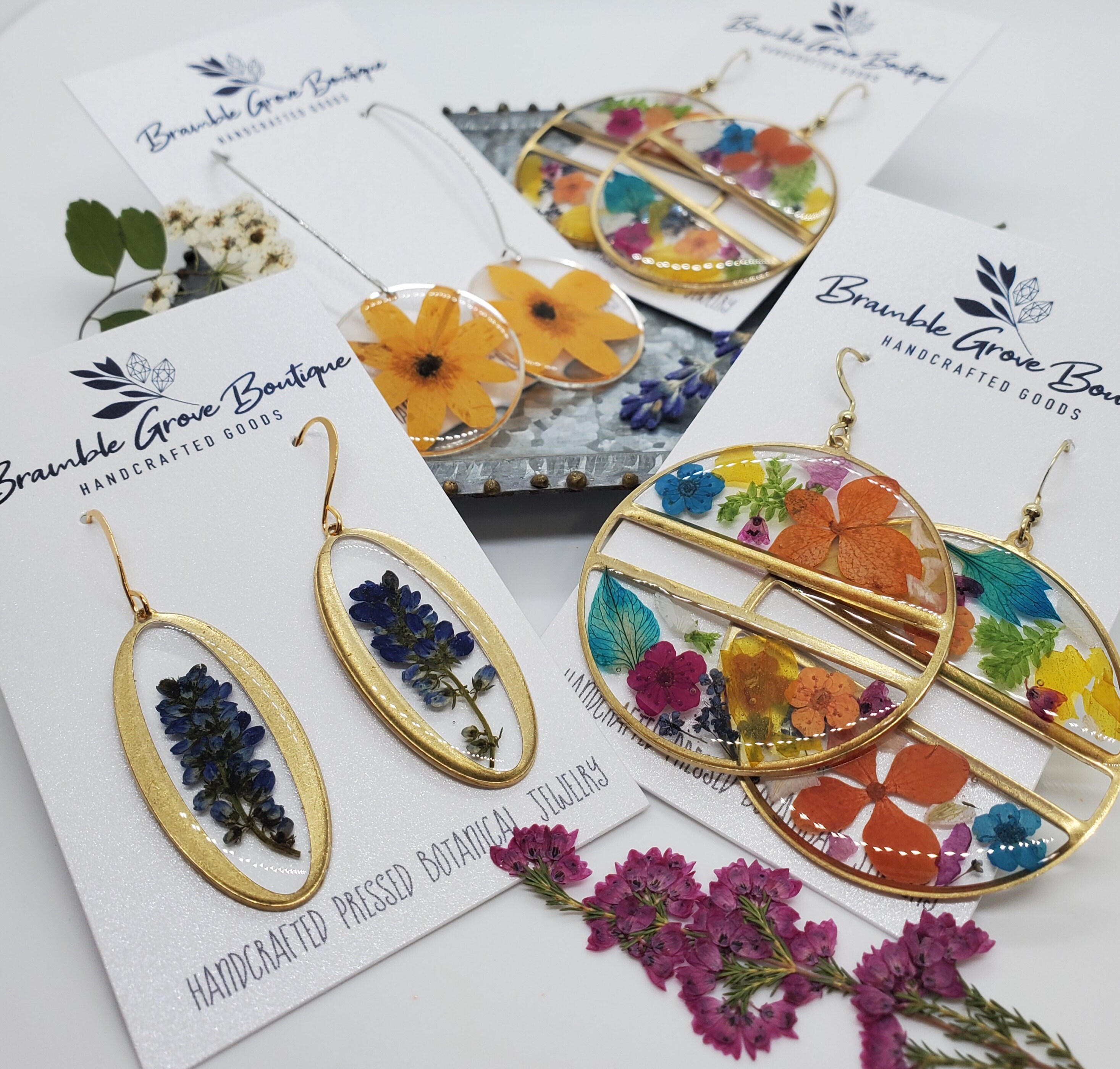I love to press my own flowers and am constantly rotating my flower presses with new blooms. I turn these into beautiful pieces of wearable art.