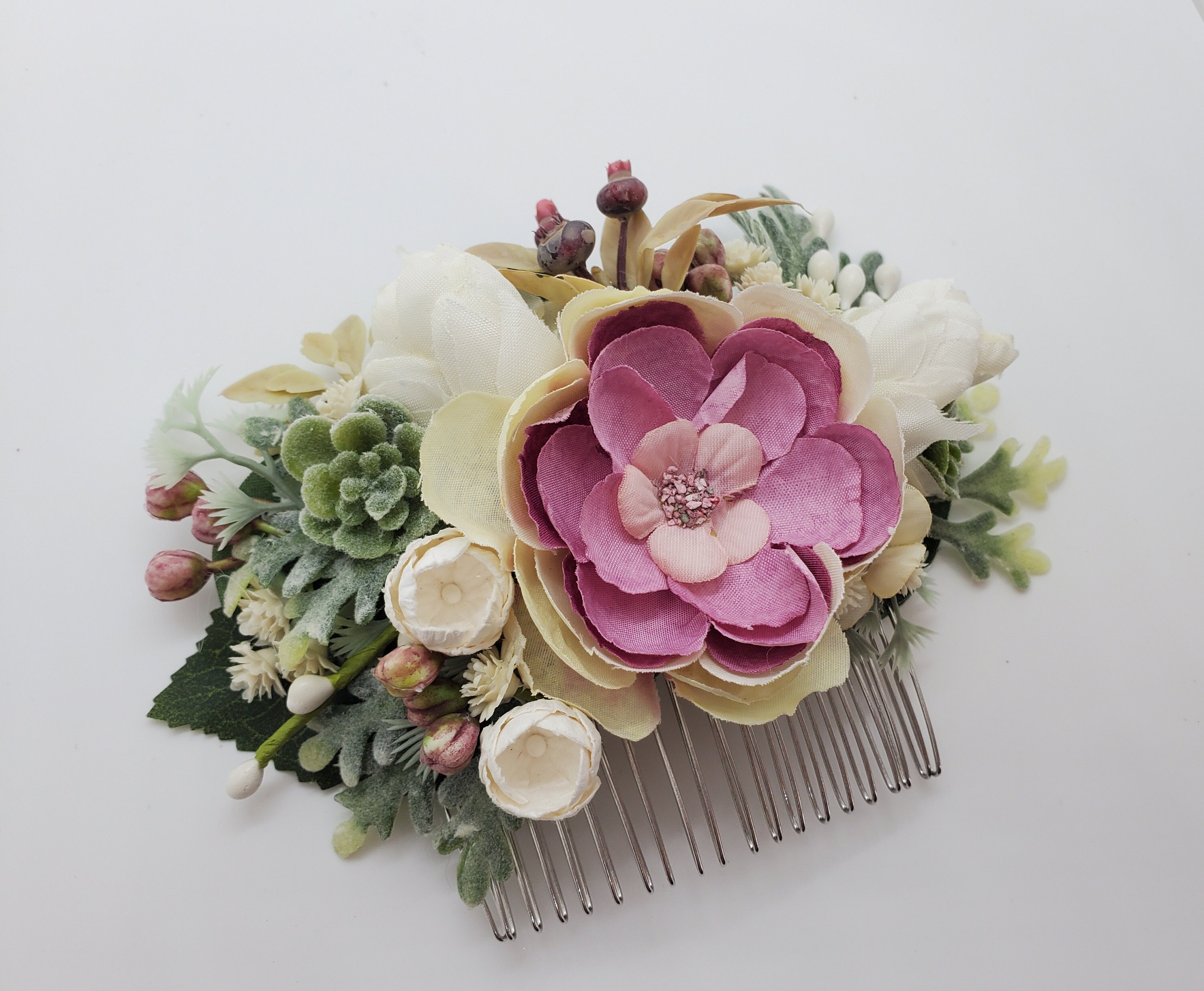 Looking for a one of a kind hair piece for your special day? I can create a custom color hair piece with beautiful realistic flowers and greenery.