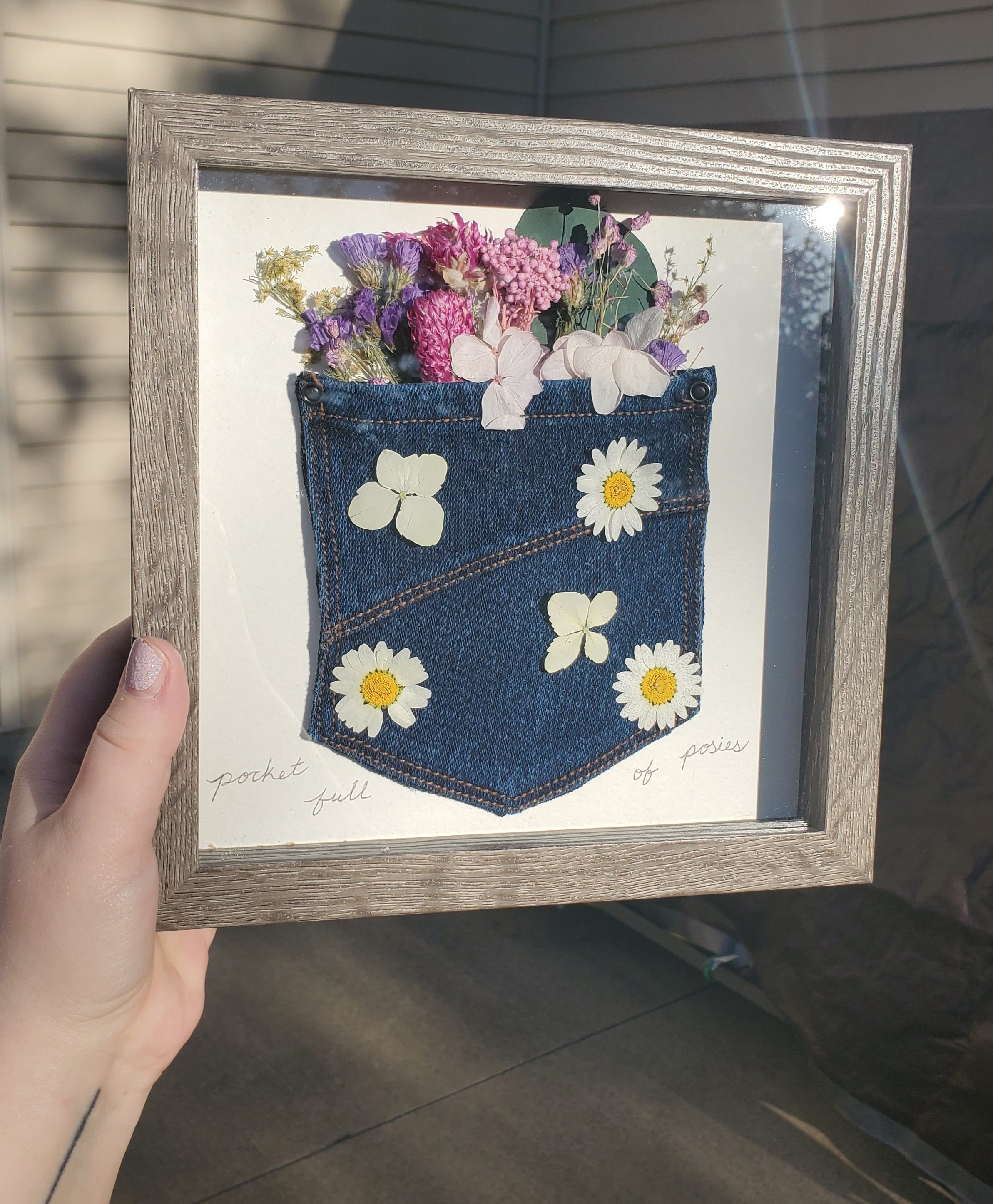 Pocket posy frames. Created with a jean pocket and stuffed with beautiful dried flowers inside a shadow box. Available in barn gray and white. These make a beautiful statement piece hanging on your wall or standing on a counter.