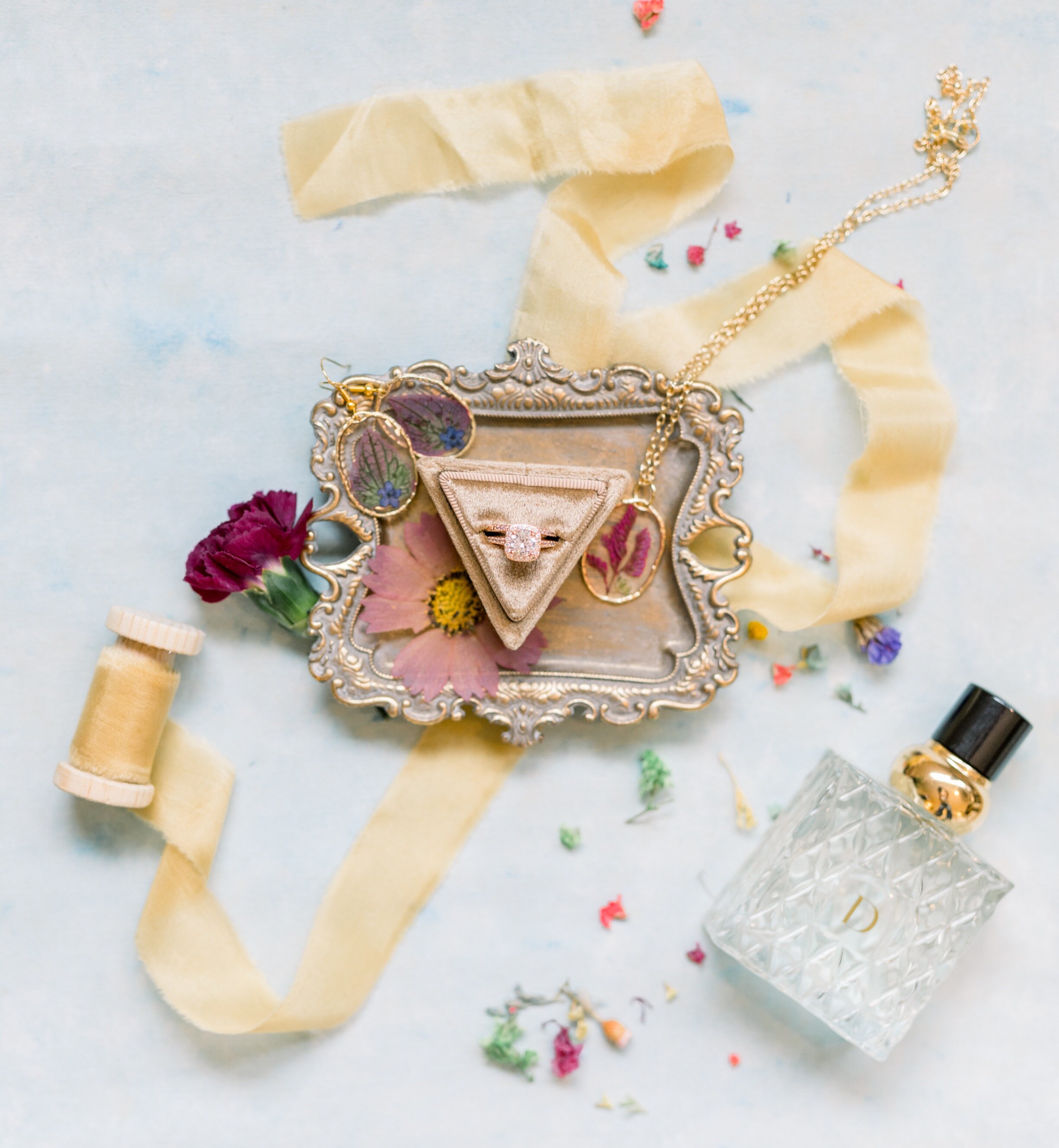 A flat lay photo from a wedding photoshoot some of my jewelry was featured in.