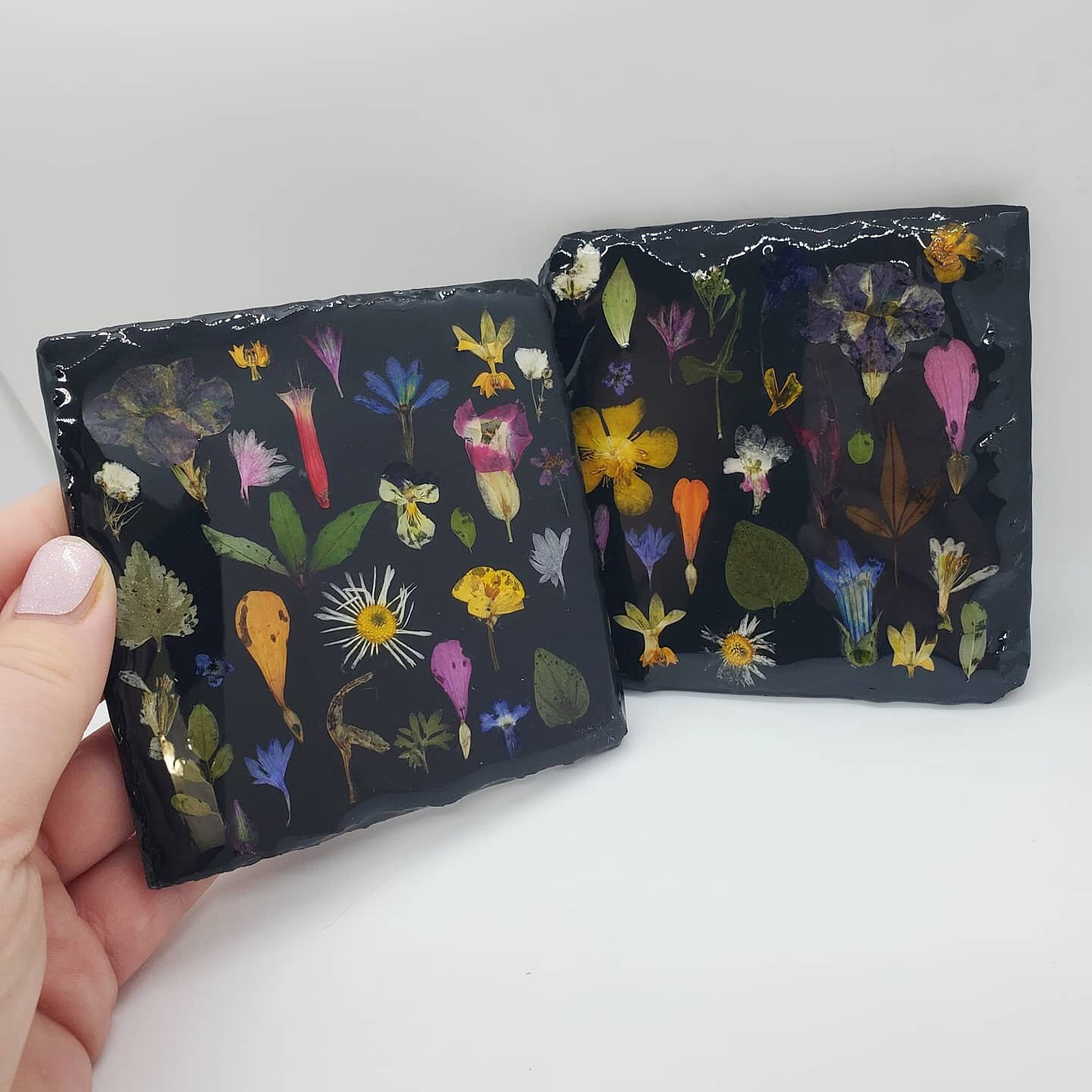 Slate patio coasters created with many tiny blooms and ferns. These one of a kind coasters are great to display in your garden, workshop, and patio.