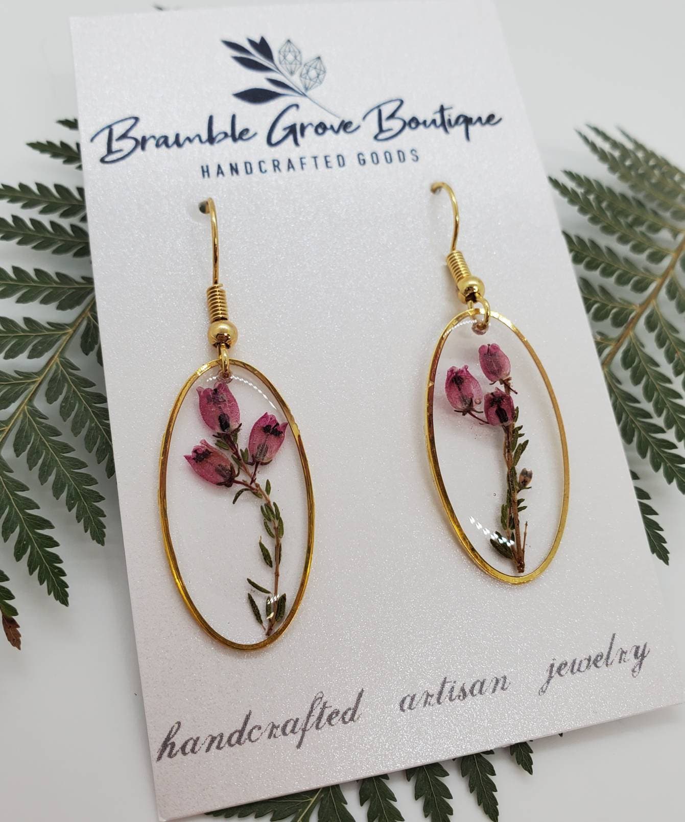 Real pressed Heather flowers sealed in resin with beautiful elegant oval bezels.